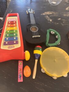 | 7 instruments de musique pour enfant Harmonica, 2 tambourines, xylophone et son maillet, maracas, oeuf shaker et guitare $20 Article : JMU1 |