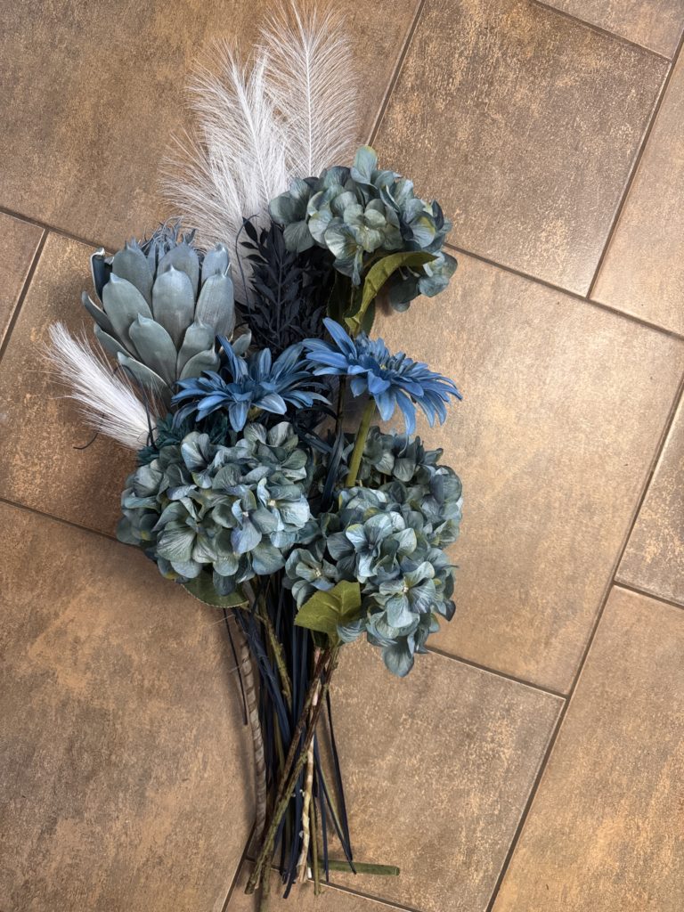 Arrangement floral (sans pot) bleu et blanc (25po de haut)
