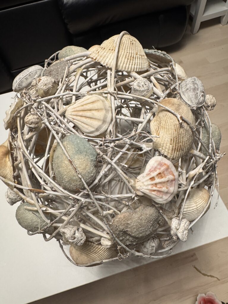 Grande boule constituée d’un filet d’osier de 12po de diamètre recouverte de coquillage