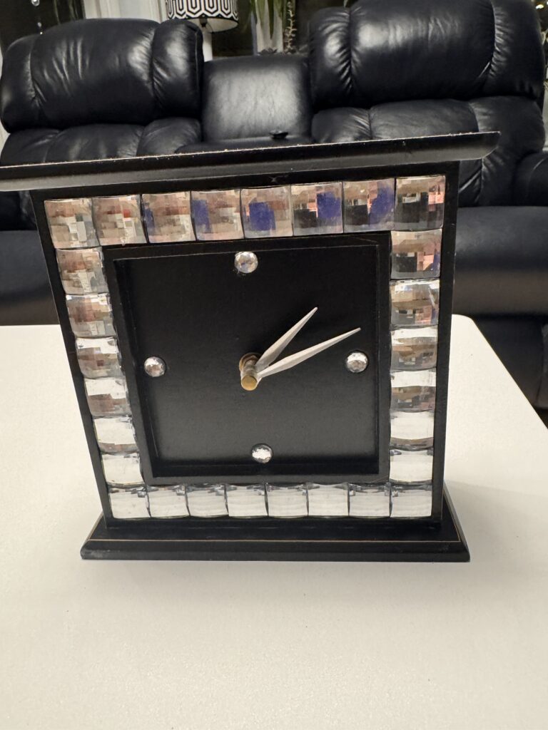 Petite horloge brun très foncé de 7po carré ornée de faux diamants