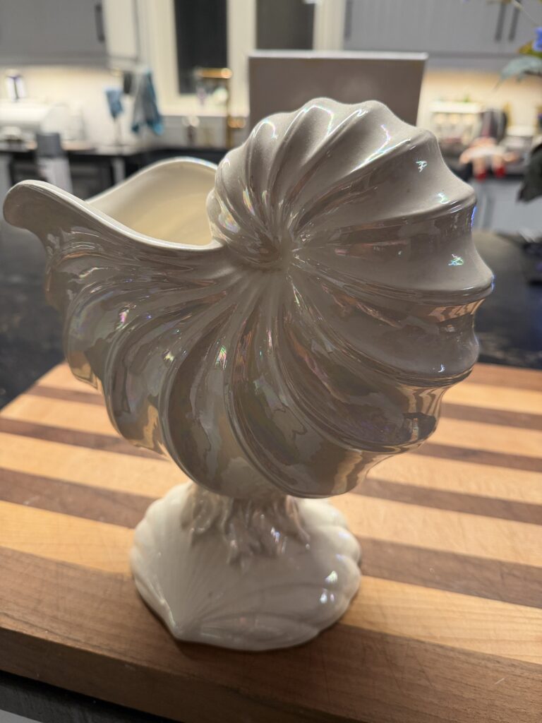 Gros coquillage sur pied en porcelaine blanc nacré (9po de long x 4.5po de large x 10po de haut)