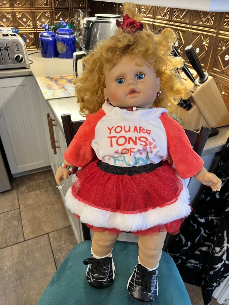 Cette poupée mesure 25po de haut; elle a les cheveux blonds bouclés; 50 vêtements (qui lui font à merveille) et accessoires sont inclus dont 2 paires de souliers, 1 paire d’espadrilles, 2 paires de pantoufles, des robes, jupes, pantalons, gilets, pyjama, chapeaux, foulard, bandeaux pour les cheveux, bas, lunettes, bijoux, verre, etc. Elle a aussi sont petit chevreuil chantant des mélodies de Noël
