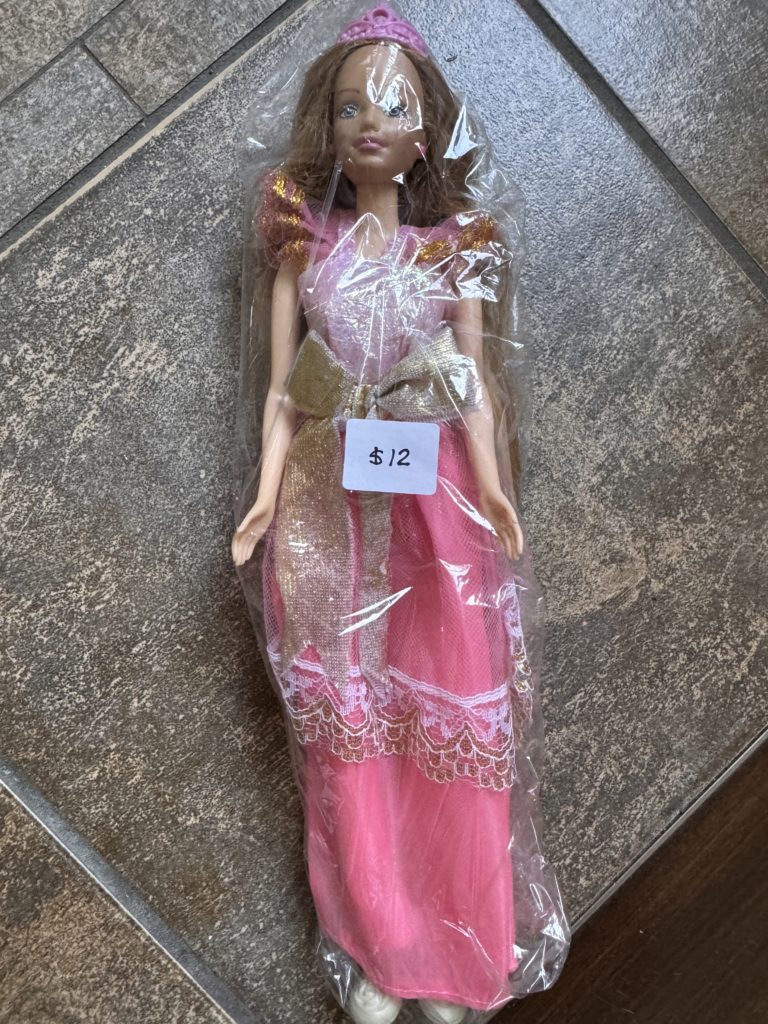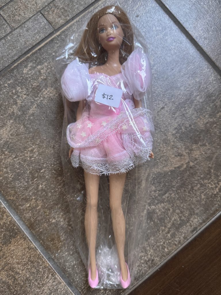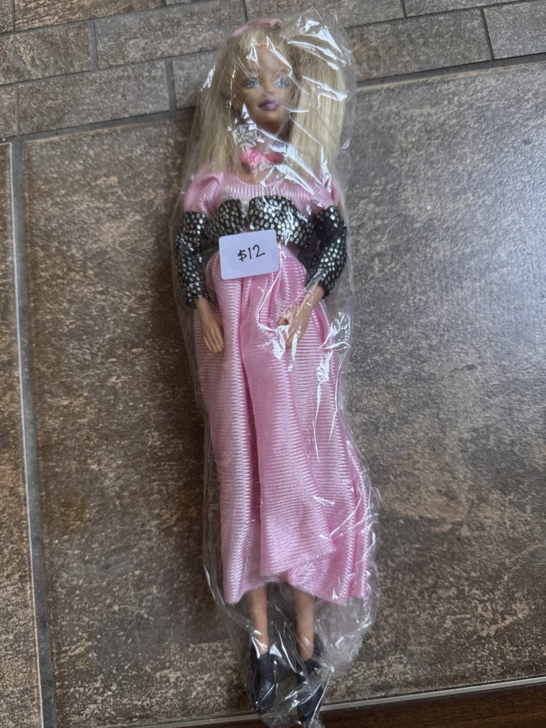 Barbie avec 5 articles : robe rose et noir, souliers noir et bijoux et accessoire de cheveux rose