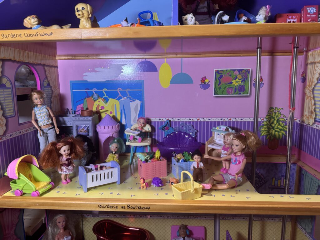 Inclus 4 Barbie, pleine grandeur et 2 ado de la garderie (barbies plus petites), 1 Ken, la gardienne du chenil, 8 enfants, 12 chiens/chats, 84 vêtements/accessoires, 25 meubles et 83 accessoires.