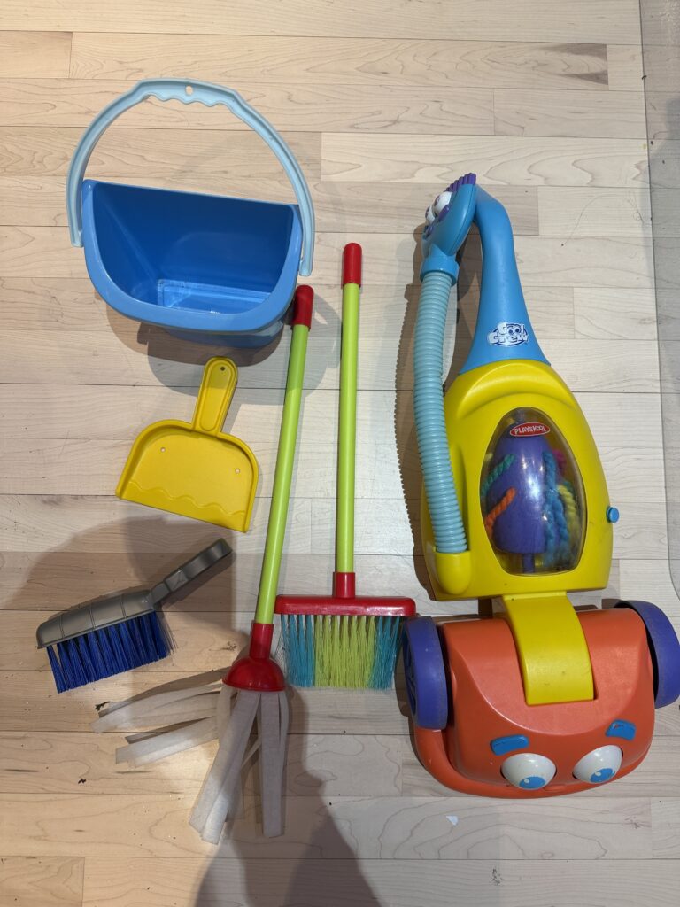 Comprenant un aspirateur (piles incluses), un grand balai, une moppe, un porte-poussière, un seau, une éponge, un détergent (faux) un torchon et un petit balai