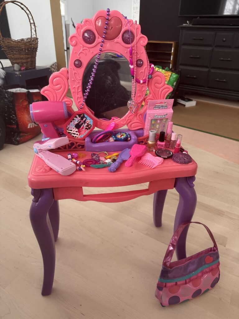 Comprend maquilleuse, banc, sac à main, bijoux, maquillage et articles pour la coiffure