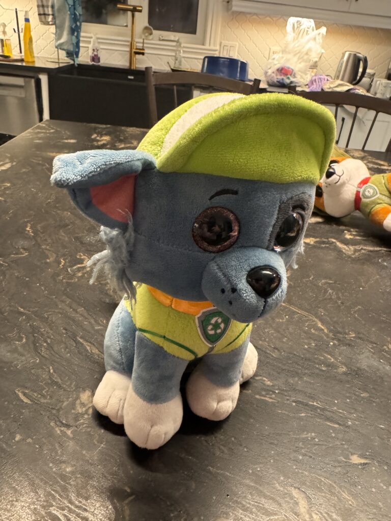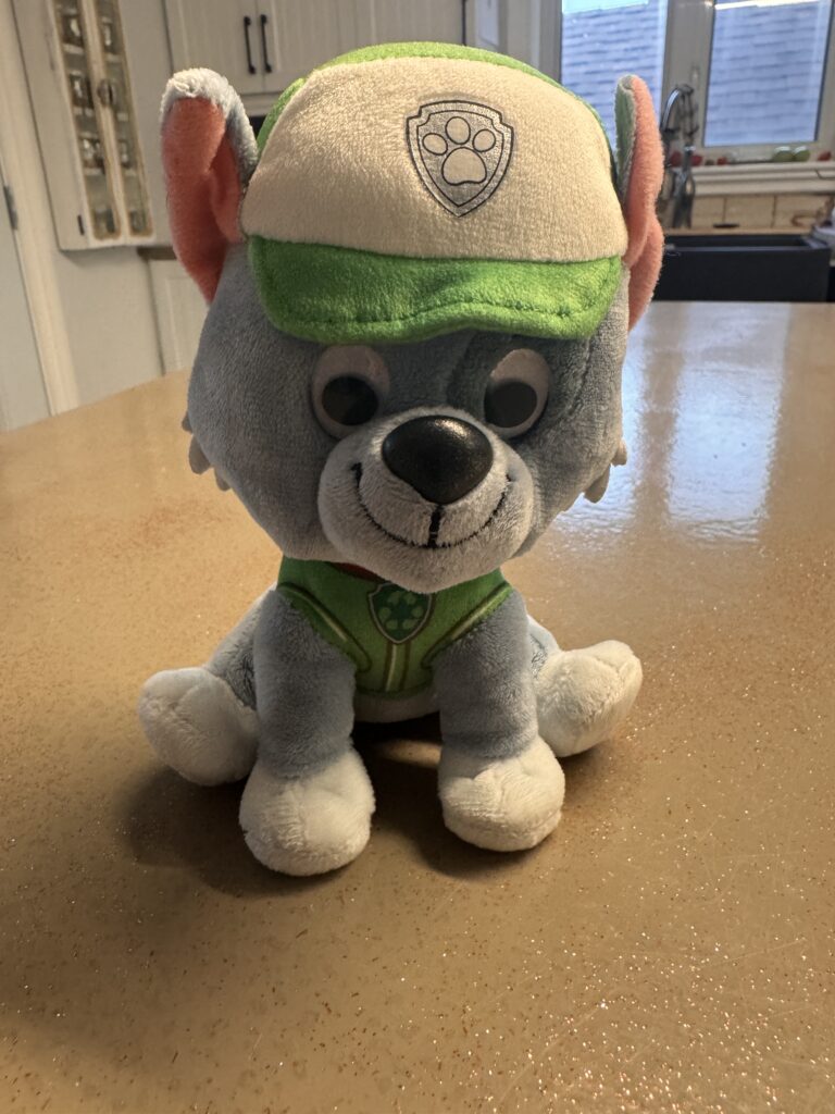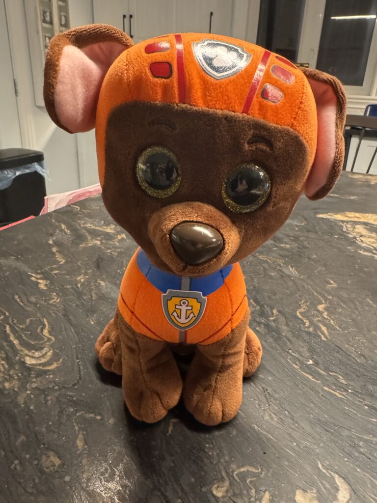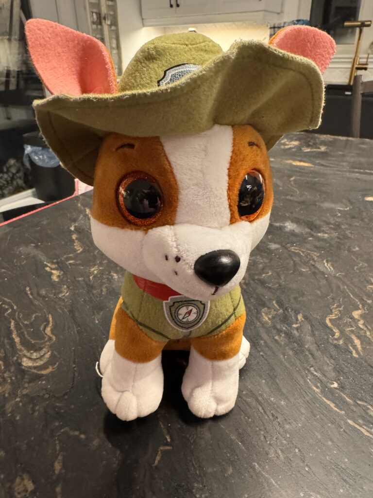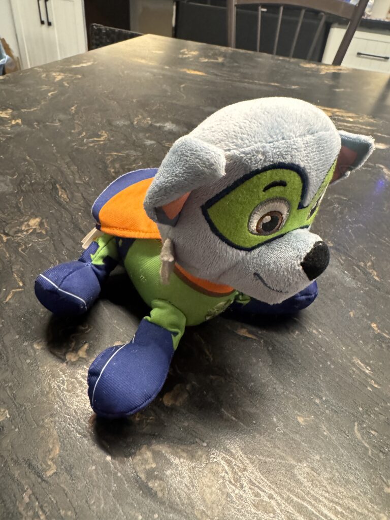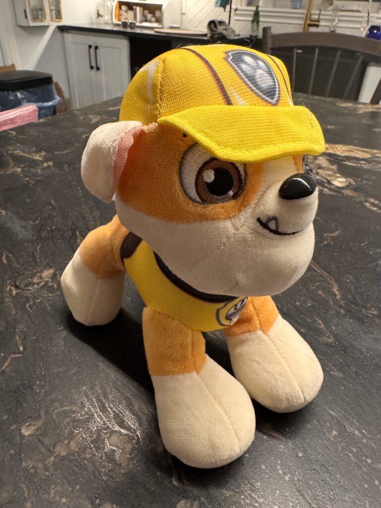 Peluche Rubble de la Pat’ Patrouille de 7.5po de haut; il tient sur ses 4 pattes et il chante