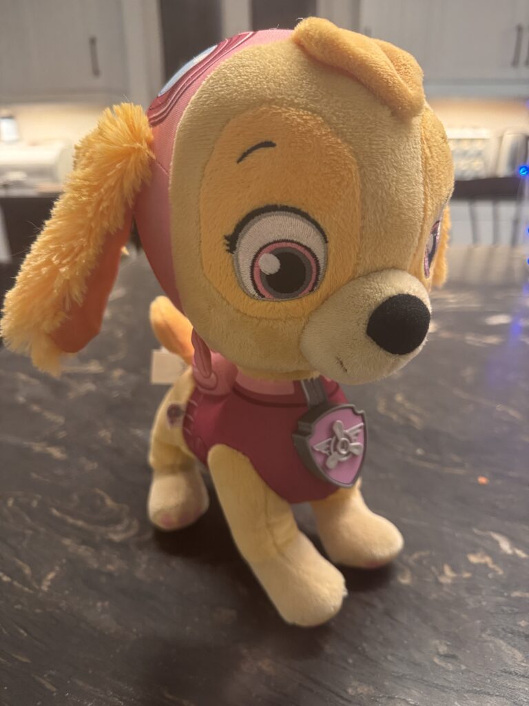Jolie peluche Skye de la Pat’ Patrouille à quatre pattes de 10po de haut; elle est bilingue