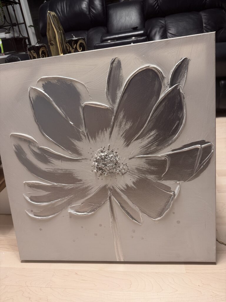 Peinture texturée d’une fleur argentée sur fond blanc (23.5po de large x 1po d’épais x 23.5po de haut
