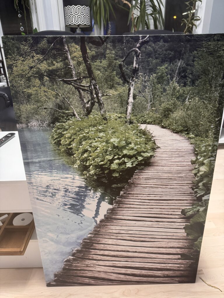 Peinture d’un chemin de planches de bois longeant ou traversant un cours d’eau en forêt