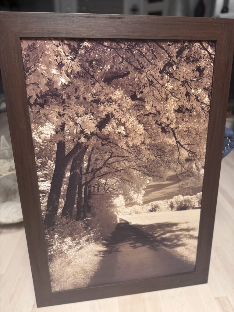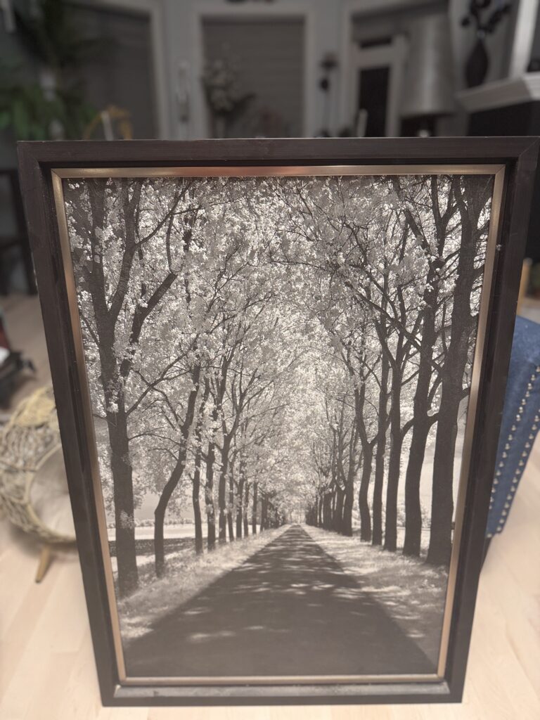 Peinture encadrée d’une route boisée en campagne (teintes du blanc au brun foncé)