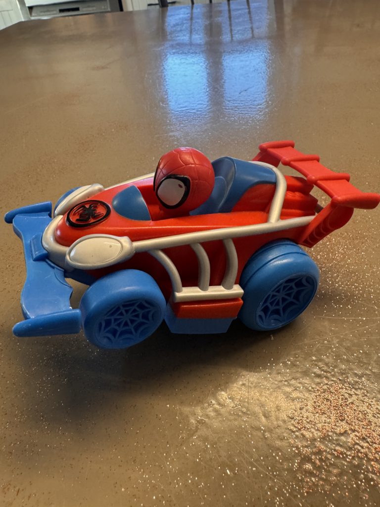 Voiture de course de Spiderman; on presse sur un bouton et ses yeux se ferment